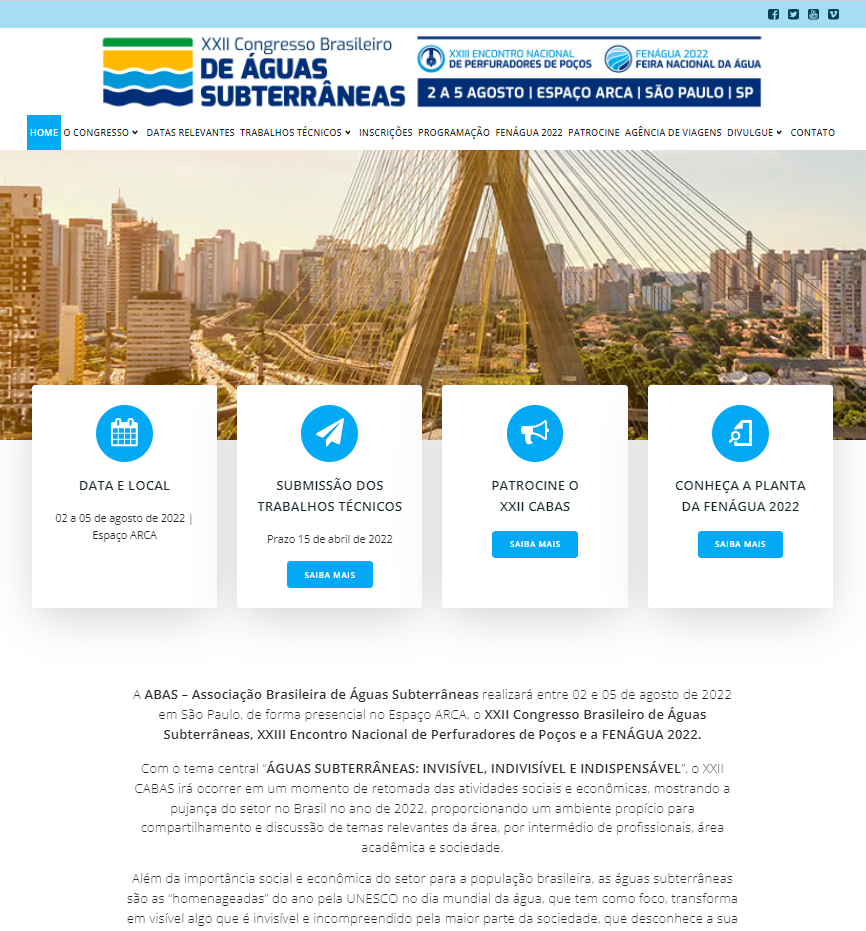 47th IAH Brazil Congress – Congresso Mundial de Águas Subterrâneas 2021 e o XXII Congresso Brasileiro de Águas Subterrâneas são exemplos de sites de eventos realizados pela Associação Brasileira de Águas Subterrâneas (ABAS) e desenvolvidos pela Guest.
